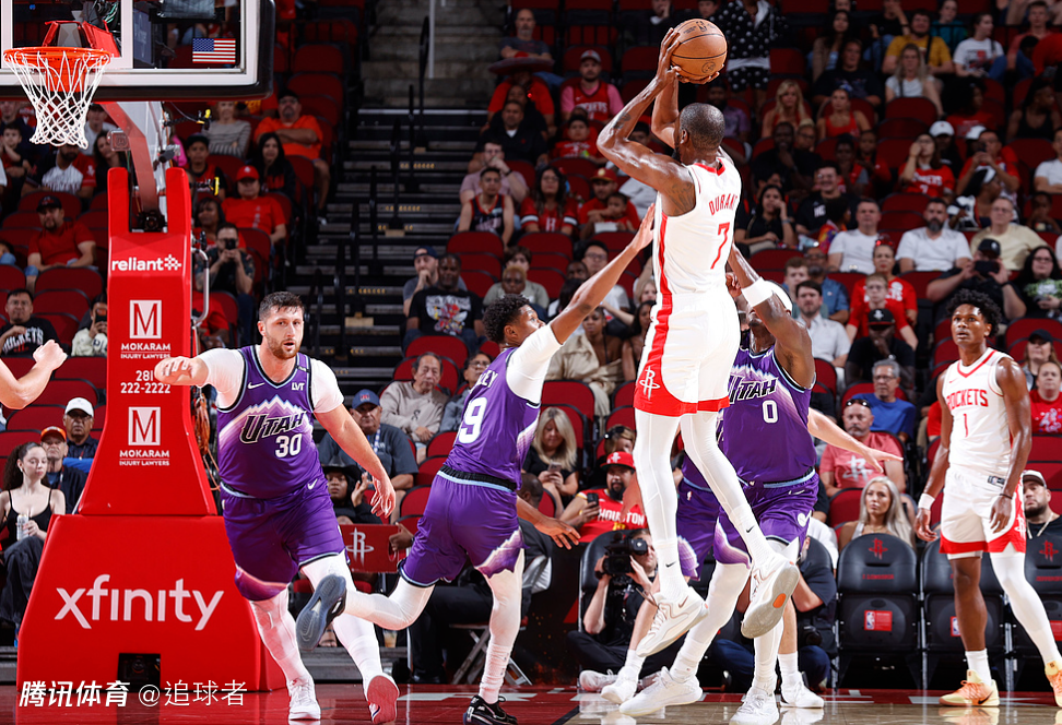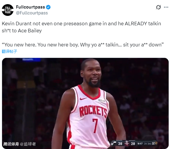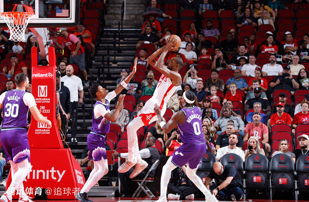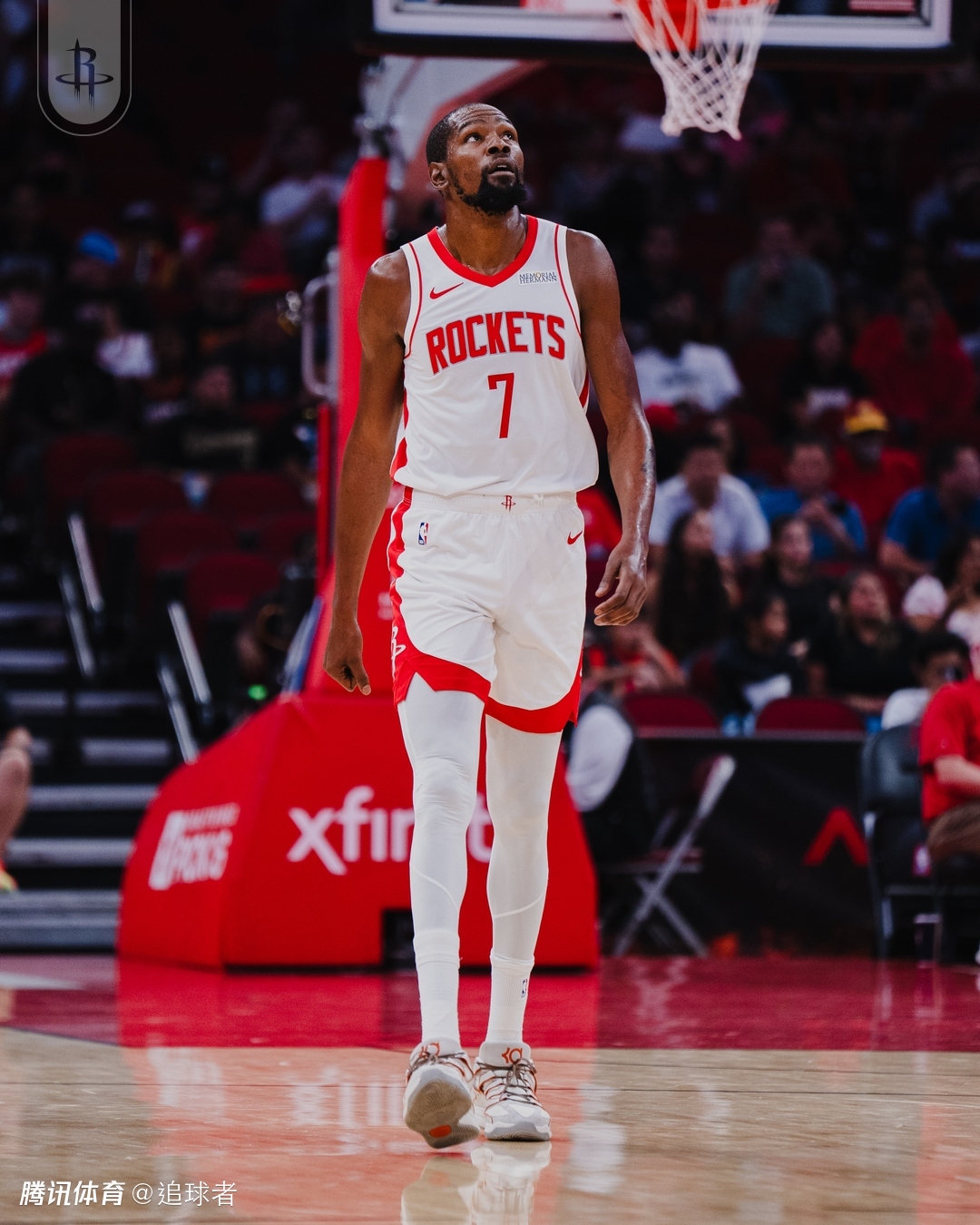 杜兰特身穿火箭7号球衣亮相,这是他为火箭出战的第一场比赛,与申京、阿门、小贾巴里-史密斯和谢波德一起首发出战,杜兰特登场时满脸笑容十分开心。