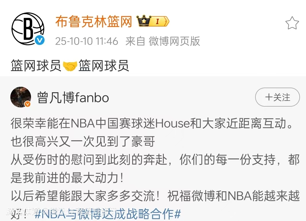 随后,篮网官方账号转发了曾凡博的动态评论道:“篮网球员(握手表情)篮网球员。”