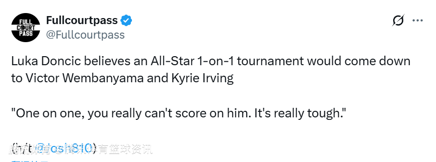 东契奇说道:“这是个难题。优秀的球员太多了,但我认为文班亚马会在其中,因为在1对1中,你几乎没法在他身上得分,这太难了。至于第二个,我可能会选欧文。你知道的,他1对1的动作简直太疯狂了。所以就是这两个人。”