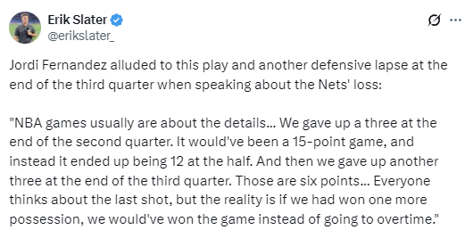 费尔南德斯还提到了篮网队在第二节和第三节末尾所出现的防守问题,他说道:“NBA比赛往往决胜于细节,第二节结束前,我们让对手投进了一记三分。原本双方的半场分差是15分,结果半场结束时分差变成了12分。然后到了第三节末,我们又让对手投进一记三分。这一下就少了6分。所有人都会关注最后一投,但事实是,只要我们多防住对手的一个进攻回合,就不用打加时赛,而是直接赢下这场比赛了。”