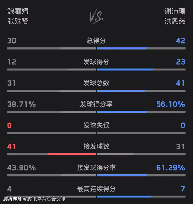 双方技术统计如下(张殊贤/鲍骊婧在前):总得分30-42、发球得分12-23、发球得分率38.71%-56.10%