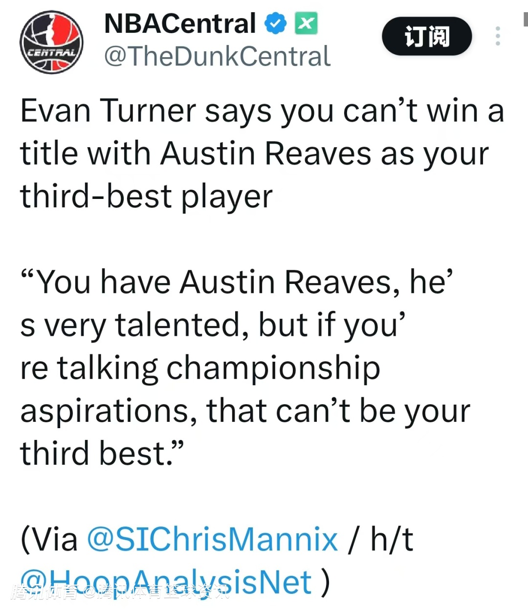埃文-特纳说道:“里夫斯很有天赋,但如果你谈论的是冲击总冠军,那他不能是你球队里第三好的球员。”