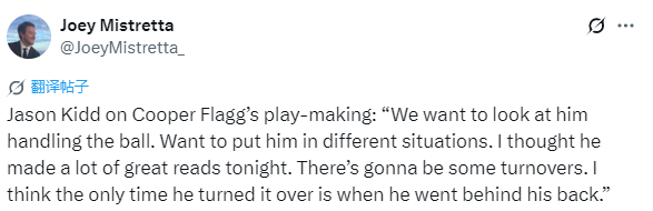 基德在谈到球队状元库珀-弗拉格的组织进攻能力时表示:“我们希望看到他持球推进,也会把他放在不同的比赛场景中去锻炼。我认为他今晚做出了很多出色的局势判断,当然过程中难免会出现一些失误。他今晚唯一的失误,我记得是在一次背后运球时发生的。”