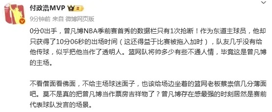 媒体人付政浩曾经在首战发文点评:0分0出手,曾凡博NBA季前赛首秀的数据栏只有1次抢断!作为东道主球员,他却只获得了10分06秒的出场时间(这还得益于比赛被拖入加时),队友几乎没有给他传球,似乎把他当作了透明人。篮网队将帅多少有些不通人情,毕竟这是曾凡博的主场。