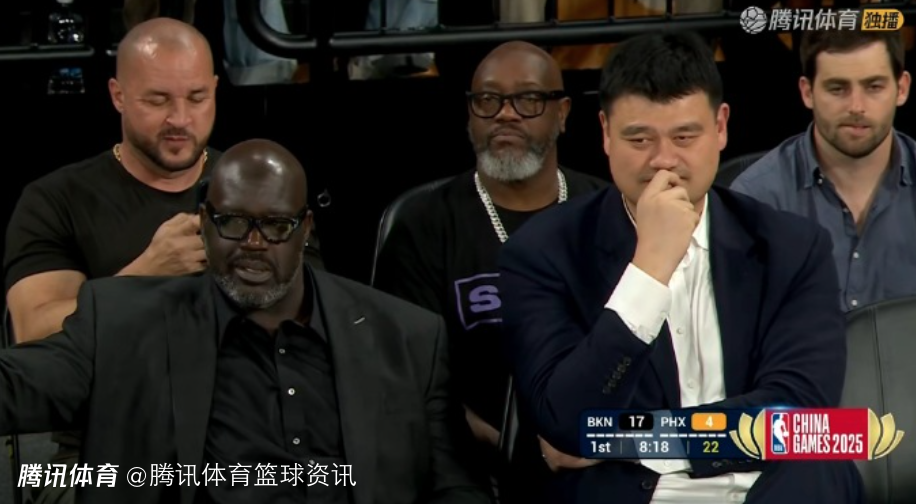 上场篮网和太阳中国赛的首战,姚明和奥尼尔坐在一起,且在比赛暂停环节中,他和奥尼尔、韦德、卡特亮相场中央,NBA特意为他们做了一个致敬环节。