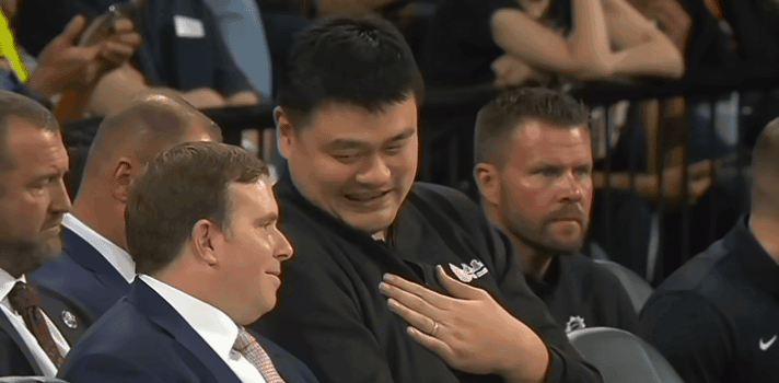 再现表情包!姚明场边观战中国赛二番战 与外籍人员交流展“魔性”笑容