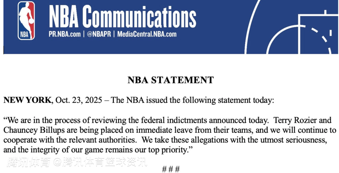 我们正在对今日公布的联邦起诉书进行审查。罗齐尔和比卢普斯将立即被其球队停职,我们将继续配合相关部门的工作。我们对这些指控高度重视,维护比赛的公正性、完整性仍是我们的首要任务。
