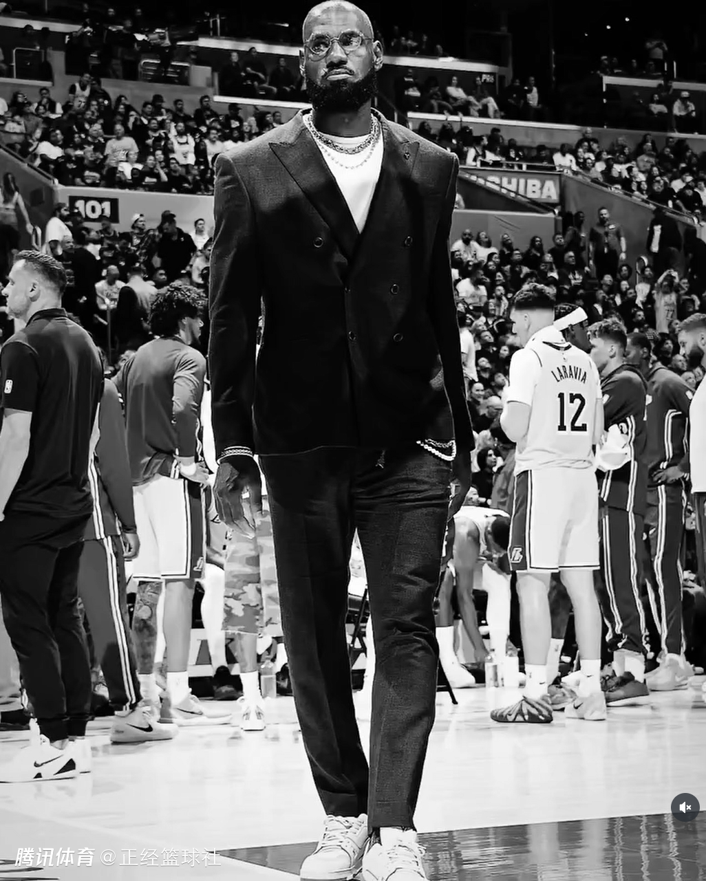 在常规赛揭幕战中,湖人队主场负于勇士队,由于遭遇伤病,詹姆斯不得不全程坐在板凳席观看比赛。值得一提的是,在终场哨声响起之前,詹姆斯就已经提前离开球场前往球员通道。整个观赛过程中,詹姆斯都没有太多表情。