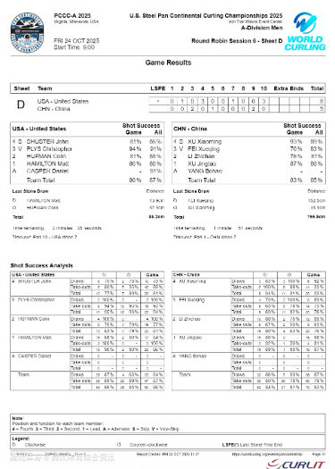 2025-10-25 07:20北京时间10月25日,在美国维吉尼亚举办的泛洲际冰壶锦标赛中,中国男队在第六场比赛中,被对手最后一投绝杀,以5-8惜败,4胜2负无缘循环赛前二。本场比赛之前,加拿大和美国同为五连胜,中国和日本均为4胜1负,加美中日提前锁定四强和明年世锦赛参赛资格。