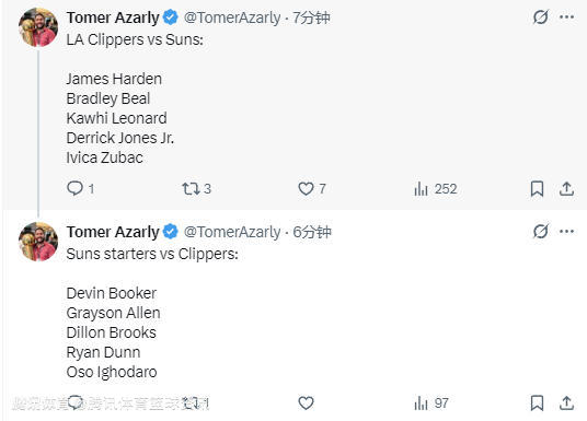 快船vs太阳首发出炉:哈登小卡领衔出战 比尔重逢前队友布克