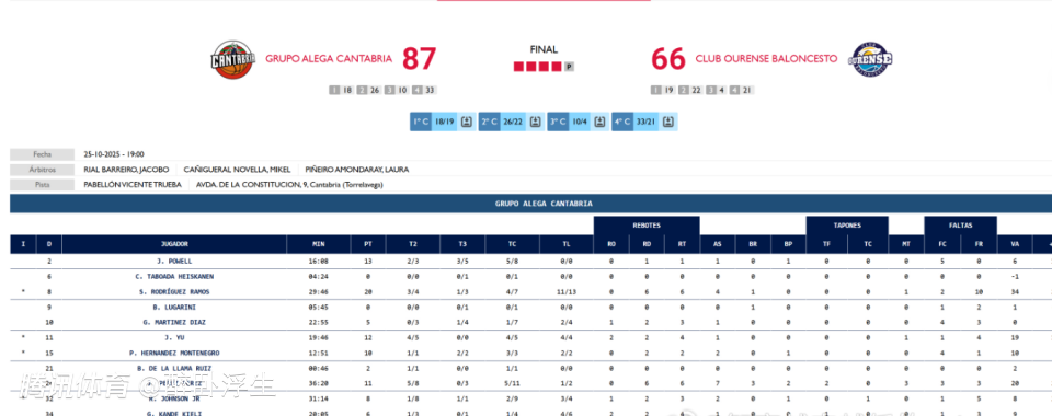 2025-10-26 09:20北京时间10月26日,中国男篮国手余嘉豪迎来留洋生涯最强一战,他首发20分钟5中4,高效得到12分4篮板,留洋首次得分上双,率领坎塔布里亚队87-66击败奥伦塞队取得第2胜。