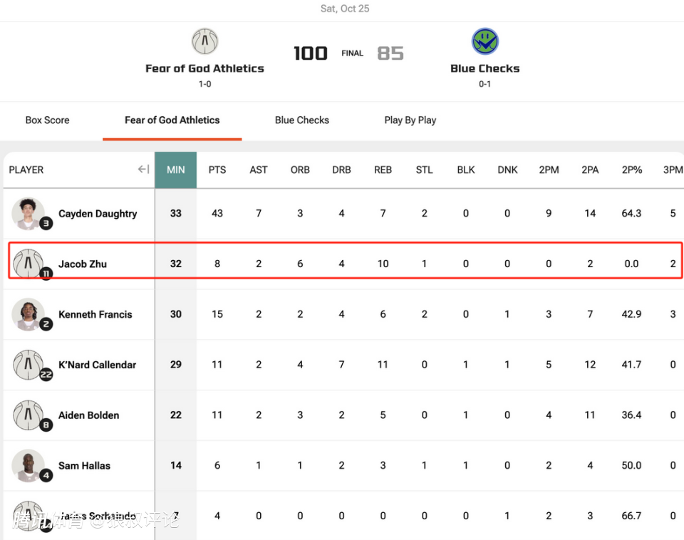 值得一提的是上一场,Fear of God Athletics 97:83 Jelly Fam。朱正首发出场30分钟,10投5中,其中三分球5中3。