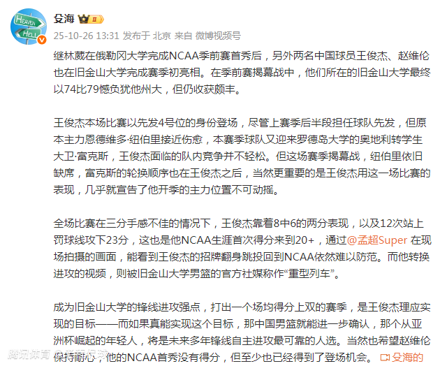 2025-10-26 23:30男篮国手王俊杰在NCAA季前赛拿到23分后,媒体人殳海表示,如果王俊杰新赛季场均得分能上双,那么,中国男篮就可以进一步确认,王俊杰就是国家队未来多年锋线自主进攻最可靠的人选。