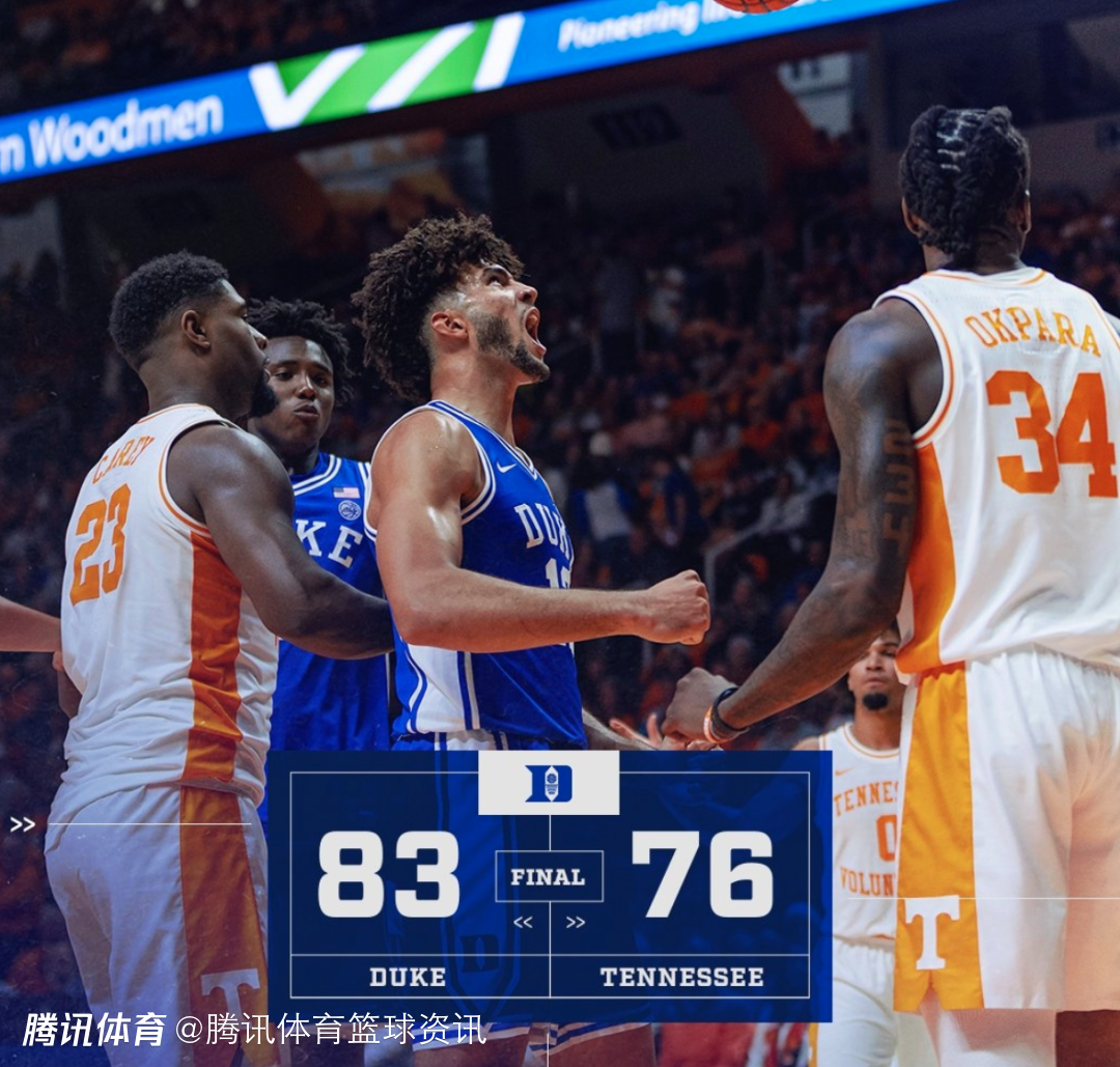 2025-10-27 10:00北京时间10月27日,NCAA季前赛,杜克大学以83-76击败田纳西大学,本场比赛明年状元大热卡梅隆-布泽尔发挥出色。
