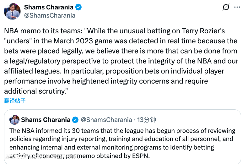 随后Shams继续补充,NBA致各球队的备忘录中写道:“虽然2023年3月那场比赛中关于罗齐尔个人数据‘下限投注’的异常投注因其通过合法渠道下注而被实时监测到,但我们认为,从法律和监管的角度来看,仍有更多措施可以采取,以保护NBA及其附属联盟的赛事公正性。”