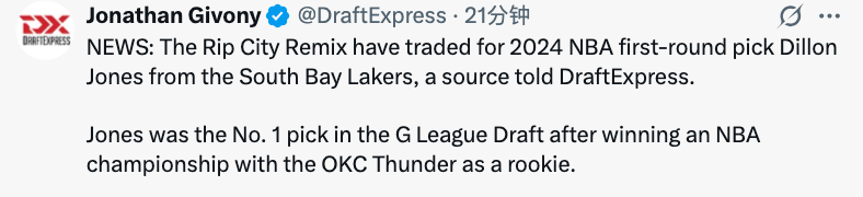 2025-10-28 01:10北京时间10月28日,据美记乔纳森-吉沃尼报道,开拓者G联盟附属球队撕裂之城混音队从南湾湖人队交易得到了2024年NBA首轮秀狄龙-琼斯。