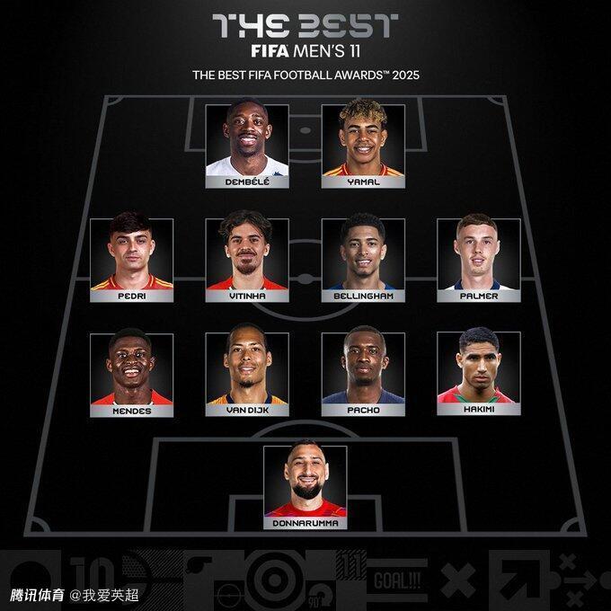 从FIFA公布的阵容来看,进攻线由登贝莱和亚马尔领衔,中场包括佩德里、维蒂尼亚、贝林厄姆和帕尔默,后防线则是努诺-门德斯、范戴克、帕乔和阿什拉夫,门将位置由多纳鲁马占据。