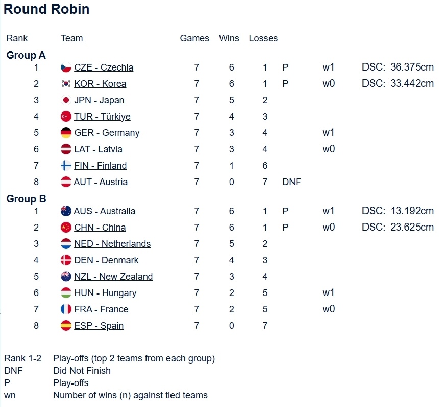 A组因为奥地利队在第一轮2-15大败于捷克之后,就选择退赛,他们之后的6轮对手都被判胜。造成的连锁反应就是韩国早早确定晋级,最后一轮里,捷克9-3大胜韩国...