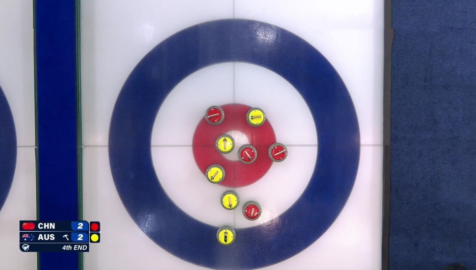 第一局:中国红壶先手,澳大利亚斗中区,于森通过击打清理占位和对方得分壶;