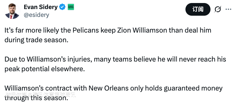 2025-12-20 00:30北京时间12月20日,据美记Evan Sidery报道,相比在交易期送走锡安,鹈鹕更有可能选择留下他。