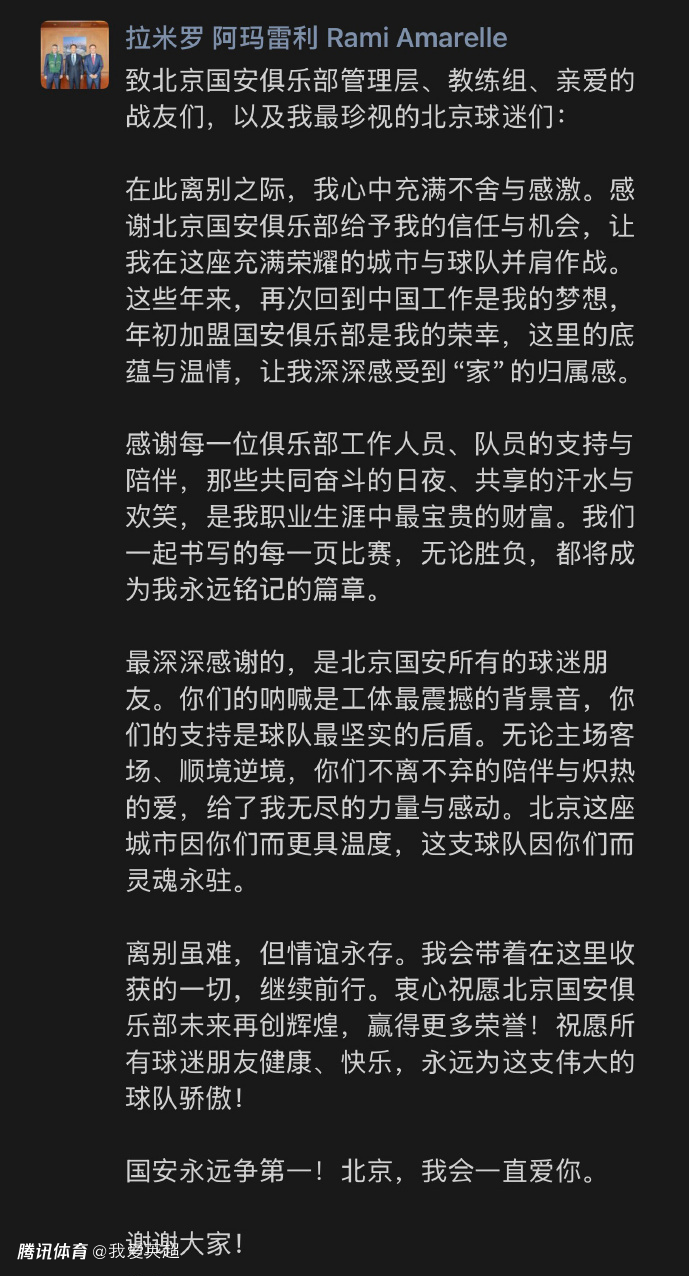 拉米罗最后动情写道:“离别虽难,但情谊永存。我会带着在这里收获的一切,继续前行。衷心祝愿国安俱乐部未来再创辉煌,赢得更多荣誉!祝愿所有球迷朋友健康、快乐,永远为这支伟大的球队骄傲!国安永远争第一!北京,我会一直爱你。”