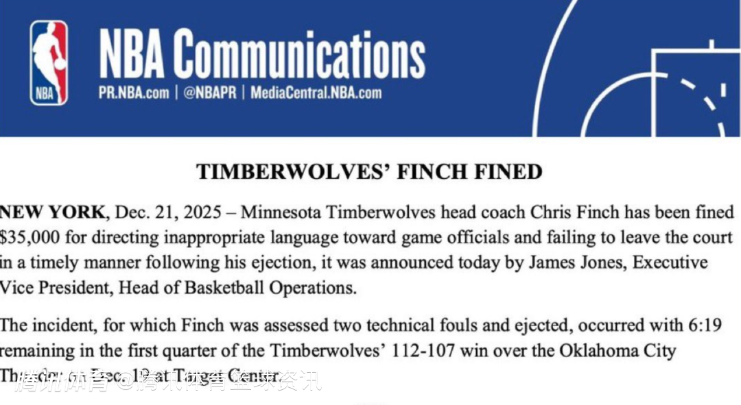 NBA篮球运营总裁兼执行副总裁詹姆斯-琼斯今日宣布:明尼苏达森林狼队主教练克里斯-芬奇因在被驱逐出场后,向裁判使用不当言论且未及时离场,被罚款3.5万美元。