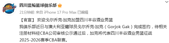 2025-12-22 10:40北京时间12月22日,根据四川男篮官方社媒公示,我俱乐部近日与澳大利亚籍球员戈尔乔克·加克(Gorjok Gak)完成签约,待相关注册材料经CBA公司审核公示通过后,加克将代表四川丰谷酒业男篮征战2025-2026赛季CBA联赛。