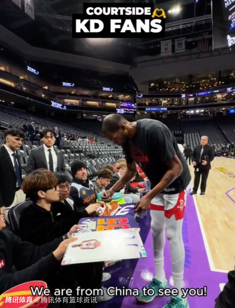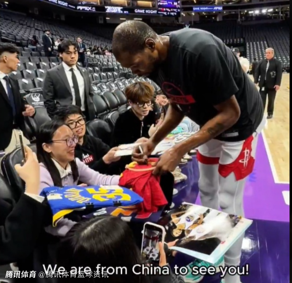 2025-12-22 11:20北京时间12月22日,NBA常规赛,火箭对阵国王的赛前,杜兰特来到场边,给中国球迷签名。
