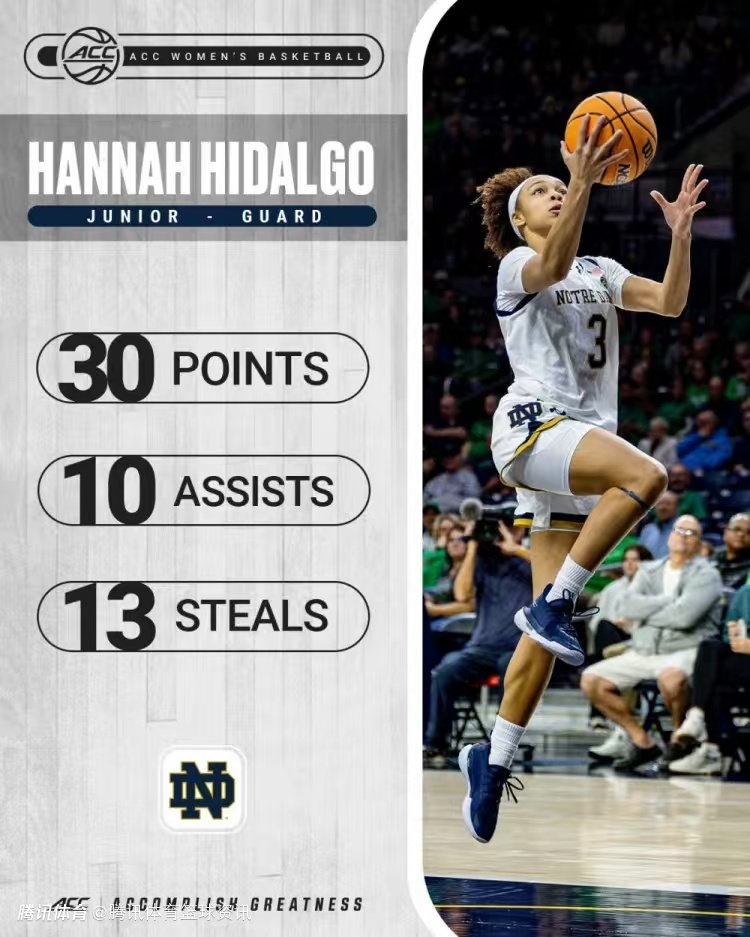 此前,在11月的NCAA D1女篮赛场,圣母大学85-58轻取阿克伦大学。汉娜-伊达尔戈同样状态炸裂,当场出战28分钟,25投16中高效轰下44分9篮板4助攻,狂揽16次抢断,单场16抢断一举刷新NCAA历史纪录。