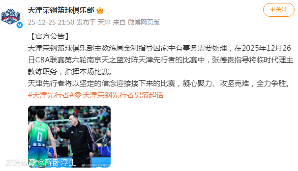 如今天津男篮官方公告显示:“天津荣钢篮球俱乐部主教练周金利指导因家中有事务需要处理,在2025年12月26日CBA联赛第六轮南京天之蓝对阵天津先行者的比赛中,张德贵指导将临时代理主教练职务,指挥本场比赛。天津先行者将以坚定的信念迎接接下来的比赛,凝心聚力、攻坚克难,全力争胜。”
