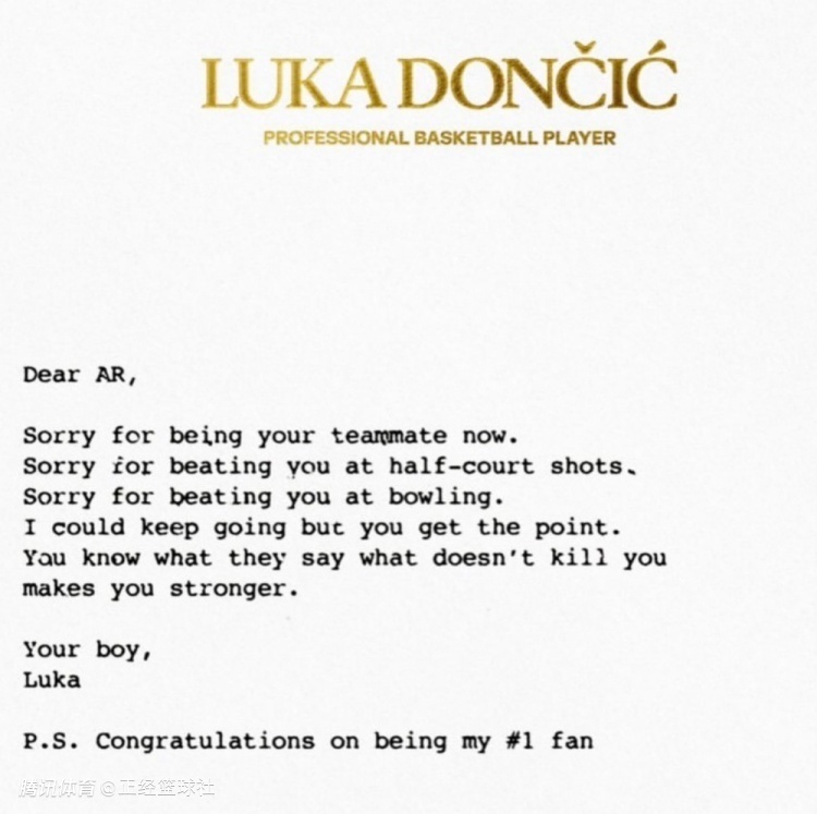 亲爱的里夫斯:很抱歉我现在成为了你的队友,很抱歉我在半场投篮比赛中击败你,很抱歉我在保龄球比赛中击败你,我还可以继续说下去,但你明白我的意思。你知道的,俗话说杀不死你的只会让你更强大!你的男孩卢卡!附言:恭喜你成为我的头号球迷!