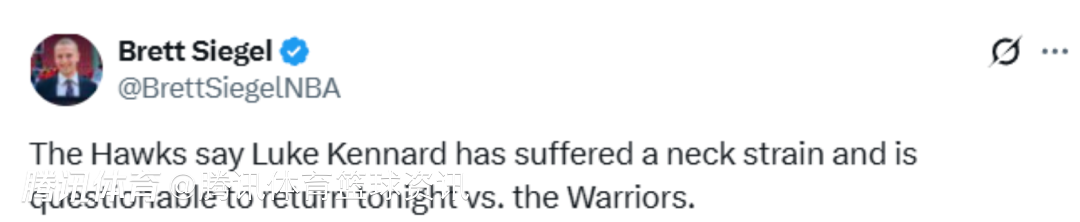 2026-01-12 10:40北京时间1月12日,NBA常规赛,老鹰客场对阵勇士,老鹰球员肯纳德在第二节伤退,据最新消息,肯纳德出现颈部拉伤的情况,本场比赛回归存疑。