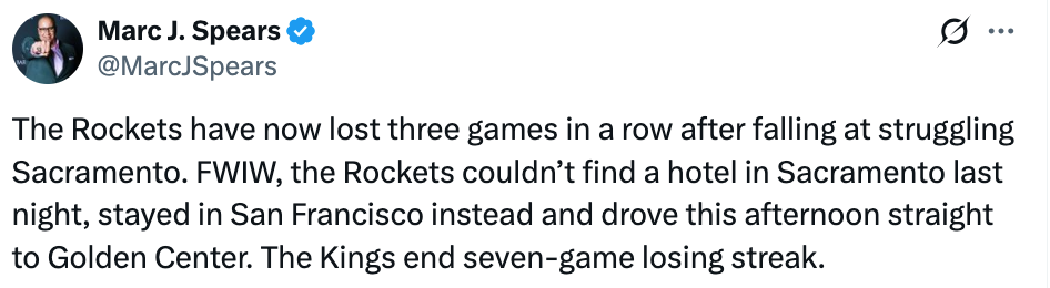 2026-01-12 13:00北京时间1月12日,NBA常规赛,火箭客场98-111不敌国王,遭遇3连败。赛后,名记斯皮尔斯透露,火箭队昨晚在萨克拉门托找不到酒店,只好住在旧金山,今天下午(当地时间)直接驱车前往国王主场。