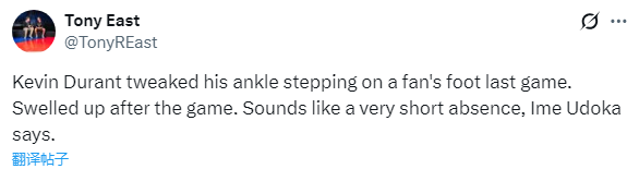 杜兰特本赛季首次因伤缺战,也是他本赛季缺席的第3场比赛,此前曾因个人原因请假缺席过2场比赛;37岁杜兰特的伤势应该不严重,下一场就有望回归,乌度卡表示,在杜兰特缺阵期间,谢泼德将首发顶替他。