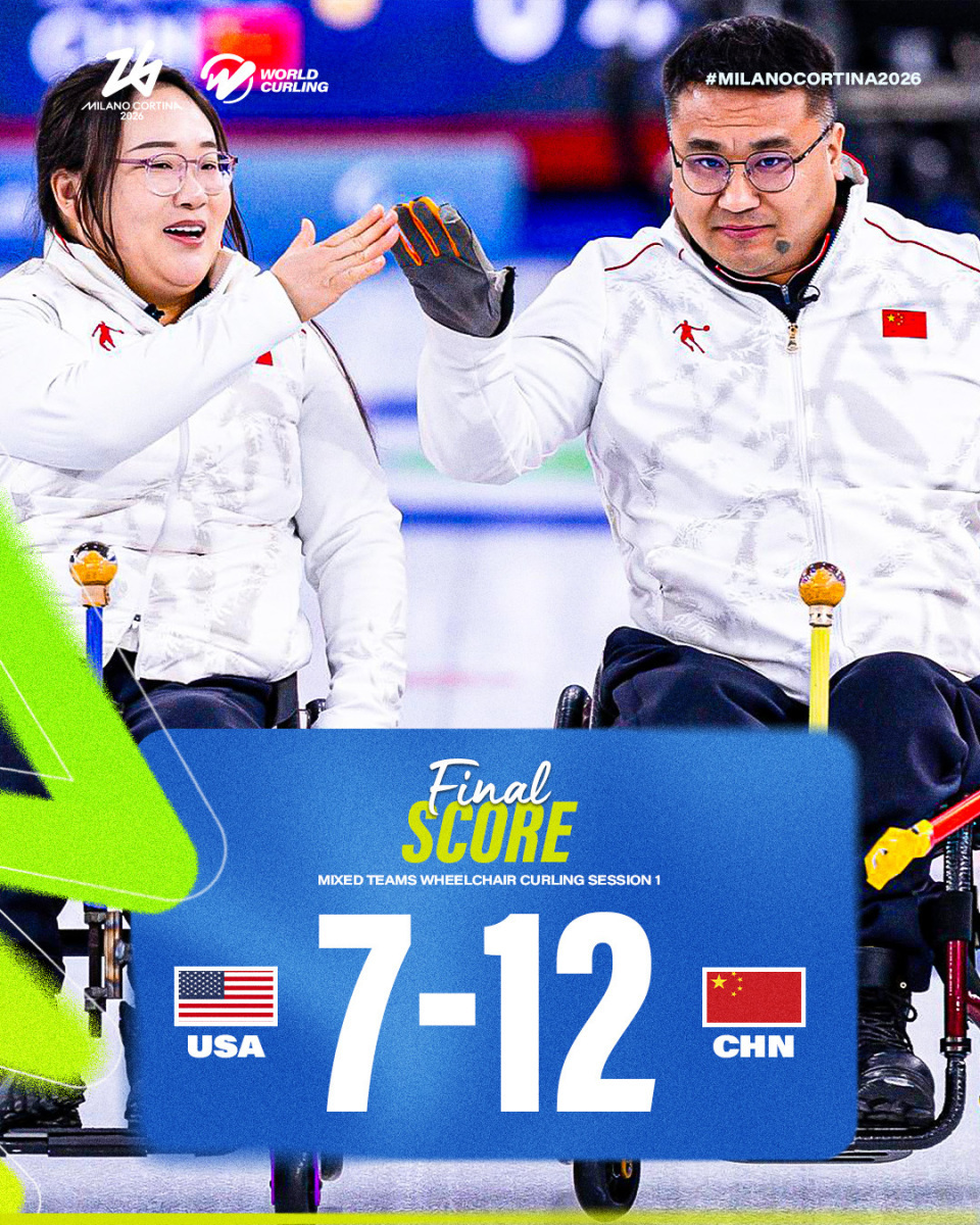 2026-03-07 20:30米兰冬残奥会轮椅冰壶混合团体结束第一轮的比拼:由四垒王海涛、三垒陈建新、二垒张明亮、一垒李娜娜、替补张强组成的中国队,发挥出高水平,他们以12-7力克美国,迎来了循环赛开门红。