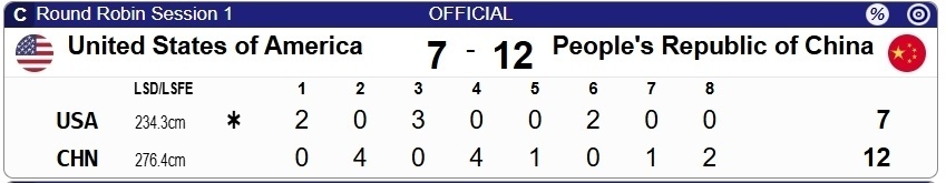 第七局:因为美国还是7-9落后,即便后手多边区占位打甩战术效果不俗,但他们只剩下第八局一个后手,所以还是要在第七局对中国进行控分。
