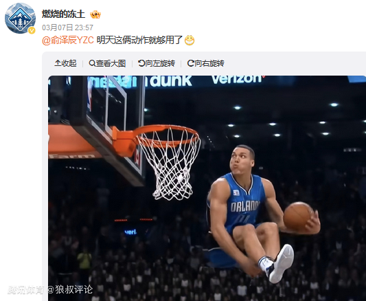 有球迷和博主调侃俞泽辰使用戈登和拉满两个经典动作。