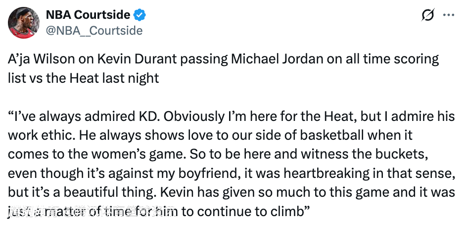 2026-03-23 01:00北京时间3月23日,最近一场火箭险胜热火的比赛中,杜兰特迎来里程碑,让自己的生涯总得分超越乔丹,WNBA球星、阿德巴约女友阿贾-威尔逊也在接受采访时,谈到了此事。