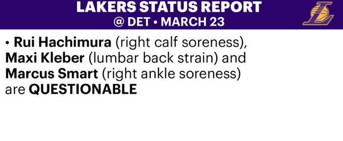 2026-03-23 05:40北京时间3月23日,NBA常规赛继续进行,湖人明日对阵活塞。赛前,湖人方面更新本场比赛伤情报告,斯马特和八村垒出战成疑。