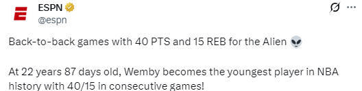 22岁87天!文班亚马连续两场至少40分15篮板 创NBA最年轻纪录