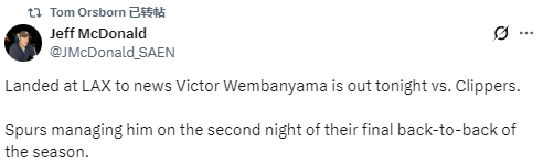 2026-04-03 06:50北京时间4月3日,NBA常规赛继续进行,马刺对阵快船。赛前,马刺队记Jeff McDonald发推表示,刚抵达洛杉矶国际机场,就得知文班亚马将缺席今天对阵快船的比赛。