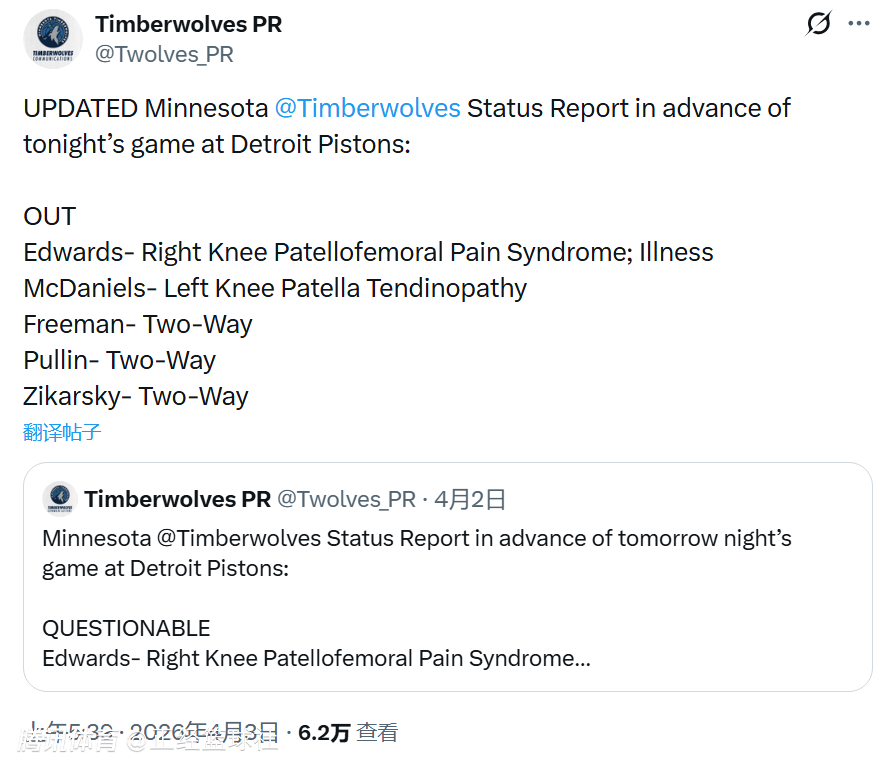 2026-04-03 06:50北京时间4月3日,NBA常规赛继续进行。根据名记Brett Siegel报道称,森林狼队球星爱德华兹将缺席今天与活塞队的比赛,这样一来,爱德华兹的出场次数未达到评奖表现,将无缘本赛季评奖。