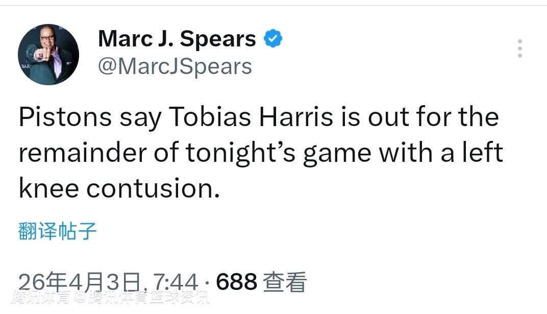2026-04-03 08:00北京时间4月3日,NBA常规赛继续进行,活塞对阵森林狼。活塞球员哈里斯首发出战。比赛进行至第二节,哈里斯在空中对抗后落地腿部受伤,返回更衣室治疗。随后,活塞官方宣布,哈里斯因左膝挫伤,本场比赛不会回归。