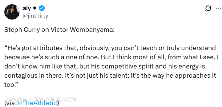 库里表示:“他身上有些特质本就是与生俱来、难以复刻的,你甚至很难完全理解,因为他本身就是独一无二的。虽然我和他并不算特别熟悉,但就我的观察而言,他的竞争意识和在场上的活力极具感染力。这不止是天赋,更在于他对待比赛的态度与方式。”