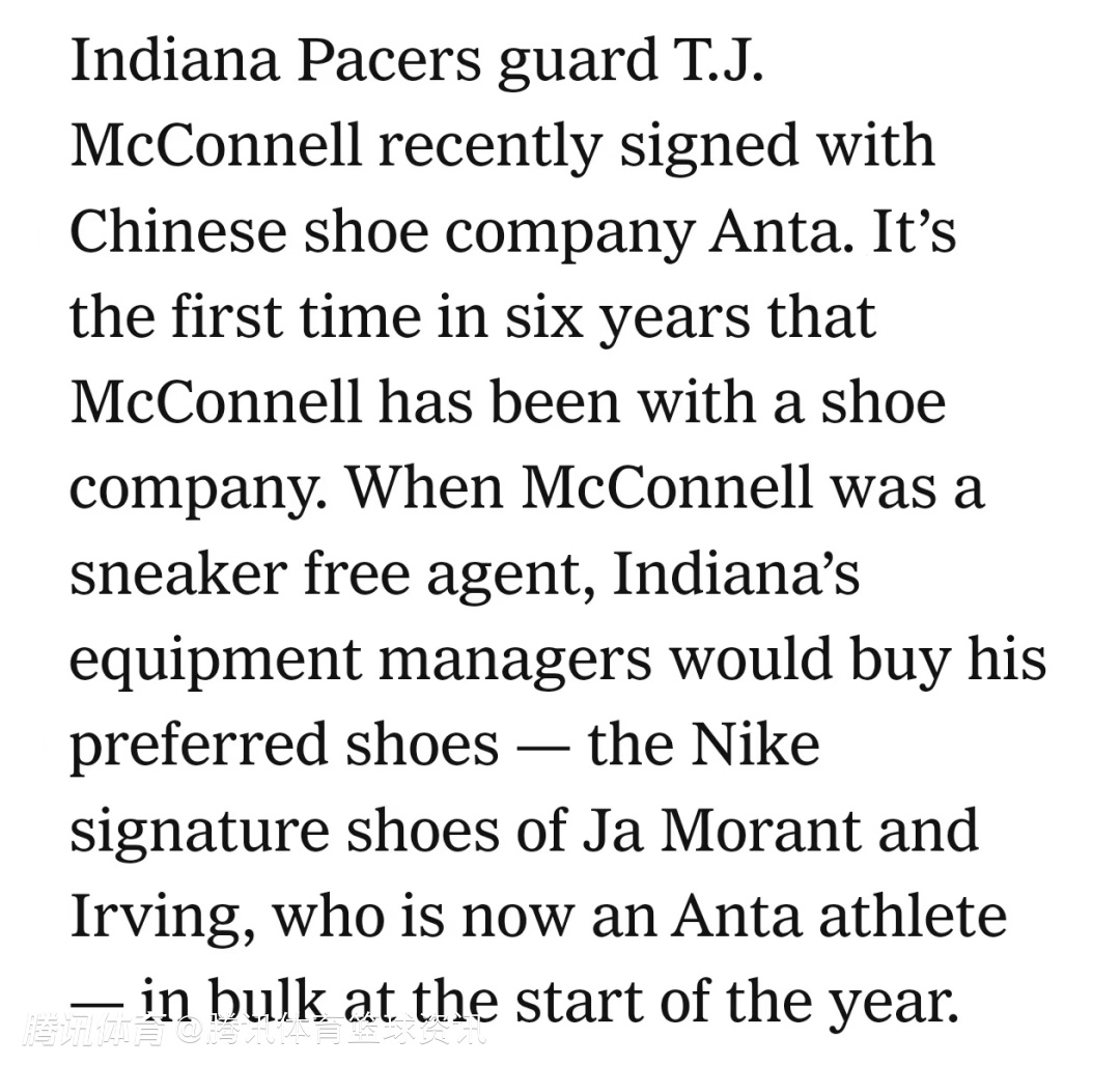 TA:步行者后卫麦康奈尔签约安踏 终结六年球鞋自由身