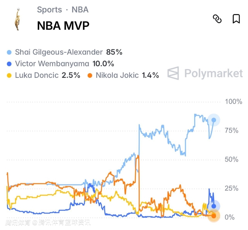 根据最新的概率预测显示,亚历山大获得MVP的概率高达85%,文班亚马10%,东契奇2.5%,约基奇1.4%。