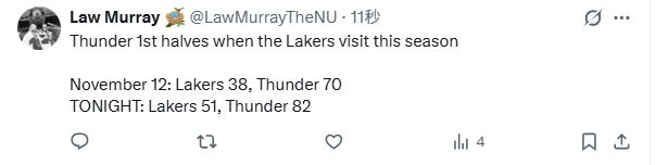 在双方本赛季首次交手时,雷霆队上半场曾70-38领先湖人队32分,而如今常规赛临近尾声,双方再次交手,湖人队上半场依然输了31分。
