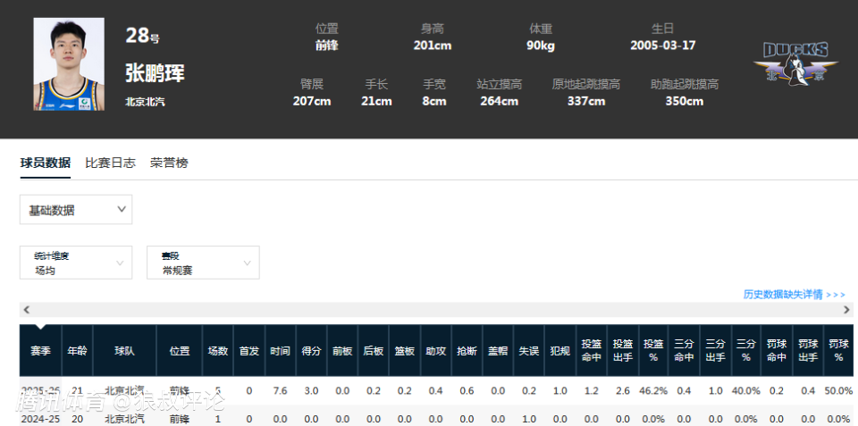 根据CBA官方的公示,张鹏珲今年只有21岁,身高2米01,臂展2米07,助跑起跳摸高350CM。在北京同档次的年轻球员当中,静态条件比较出色。