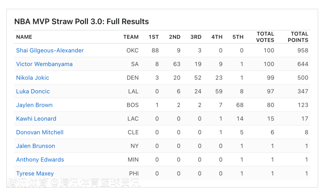 其中,亚历山大拿到第一选票88张,第二选票9张,第三选票3张;文班亚马拿到第一选票8张,第二选票63张,第三选票19张;约基奇拿到第一选票3张,第二选票20张,第三选票52张。
