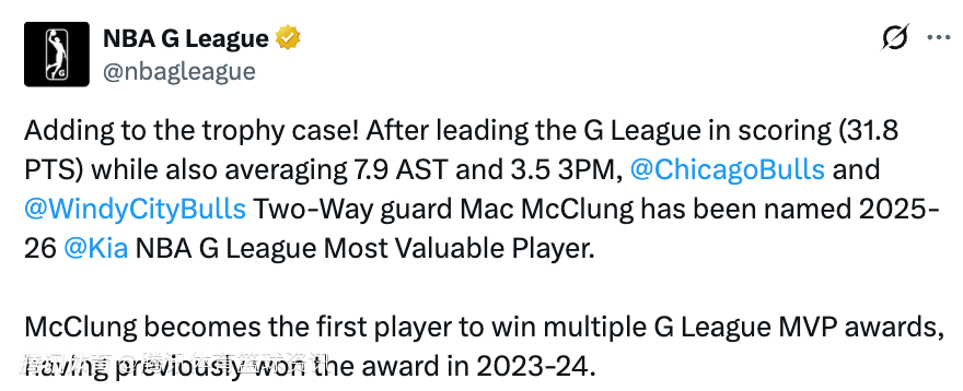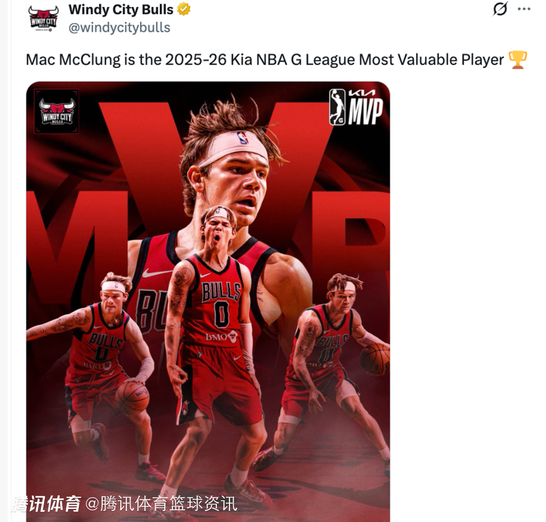2026-04-04 01:30北京时间4月4日,G联赛官方宣布,麦克朗当选本赛季的常规赛MVP。随后麦克朗所效力的G联盟球队风城公牛官方也发文祝贺麦克朗获得这一奖项。